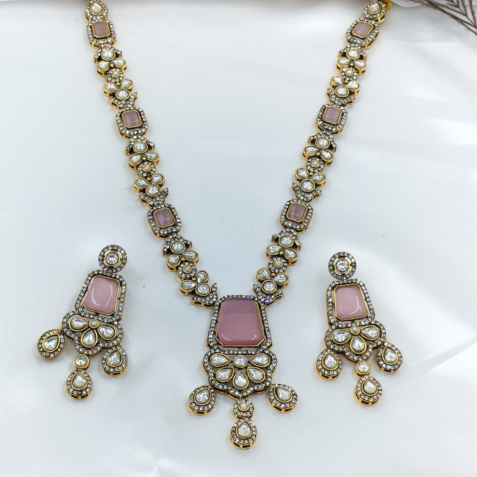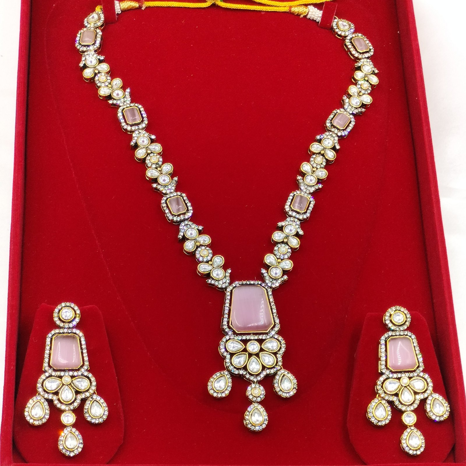 The Pink Long Kundan Necklace Set offers endless styling possibilities. Pair it with a saree, lehenga, or even an Indo-Western dress to elevate your look instantly. Its rich color and refined design complement outfits in gold, cream, pastel, or even bold hues like navy or emerald green.