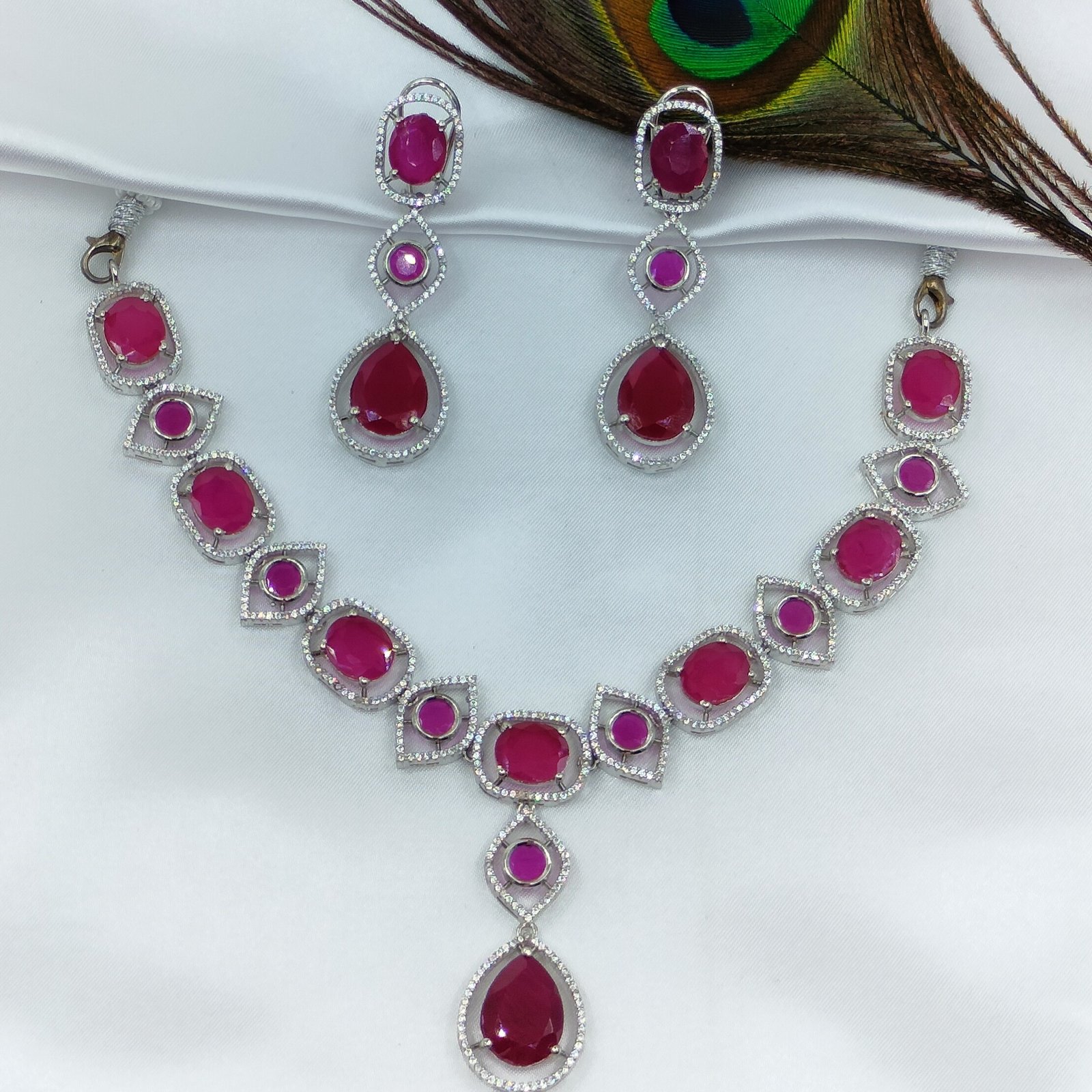 Included in the set are a pair of matching earrings that echo the same brilliance and design language. The symmetrical detailing in both necklace and earrings creates a polished, coordinated look—perfect for bridal wear, cocktail nights, and ethnic parties.