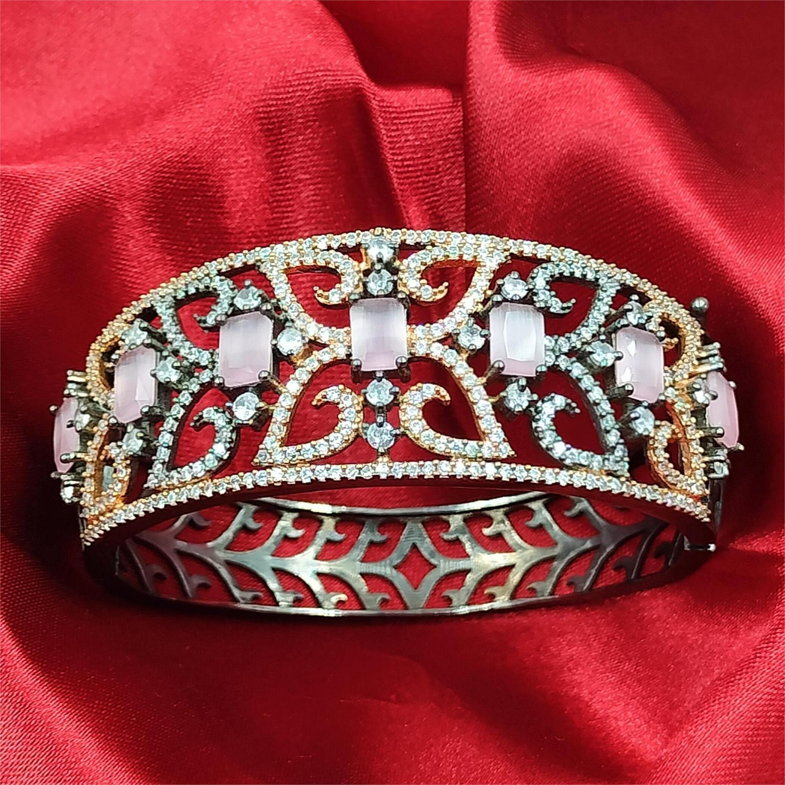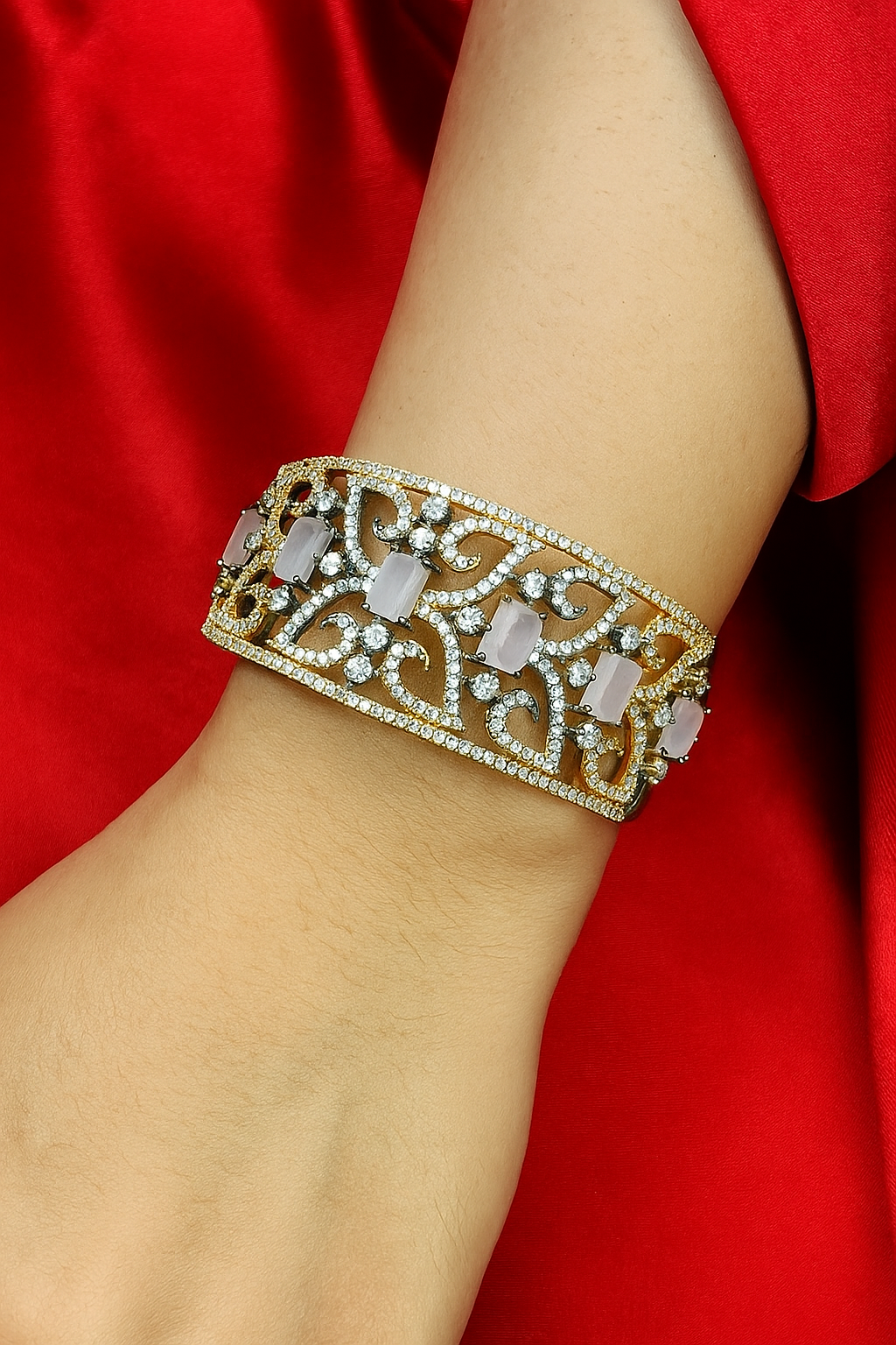 Make an elegant statement with our Rose Quartz AD Bracelet, a luxurious fusion of pastel romance and regal craftsmanship. Designed to turn heads, this bracelet features radiant rose quartz stones, each framed by glittering American Diamonds. Its dual-tone finish of antique gold and black rhodium offers a dramatic yet refined look, making it a standout piece in your festive jewelry collection.