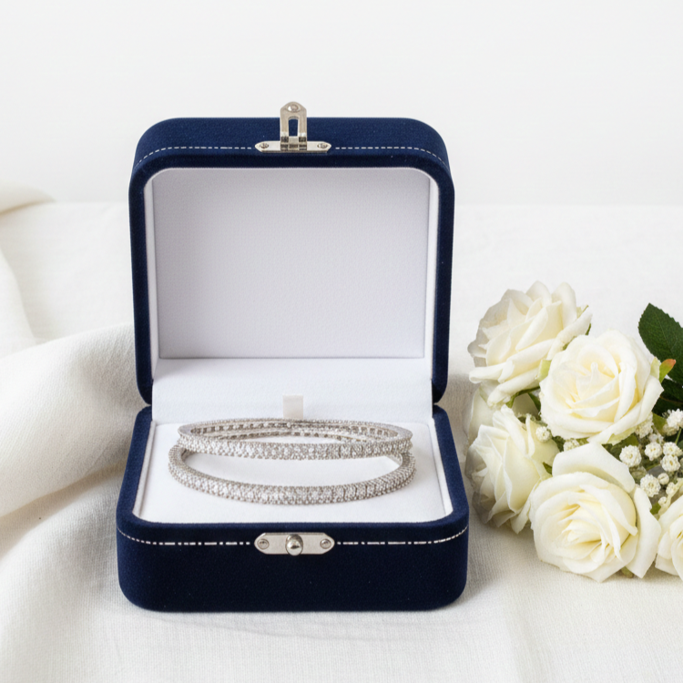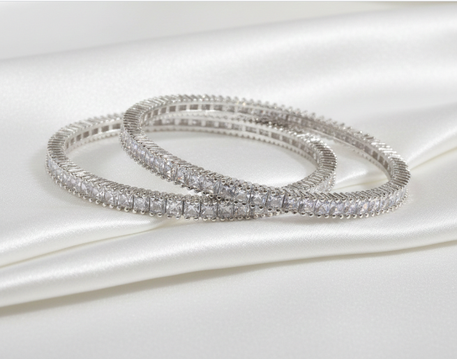 Silver Crystal  AD bangles  lies in their sleek design. Whether you’re dressing up for a bridal ceremony, pairing them with a saree for a family function, or styling them with a gown for a cocktail evening, these bangles add the right amount of glamour without being overwhelming. Brides often prefer designer AD bangles for weddings because they offer the sparkle of real diamonds at a fraction of the cost, allowing them to mix elegance with affordability.