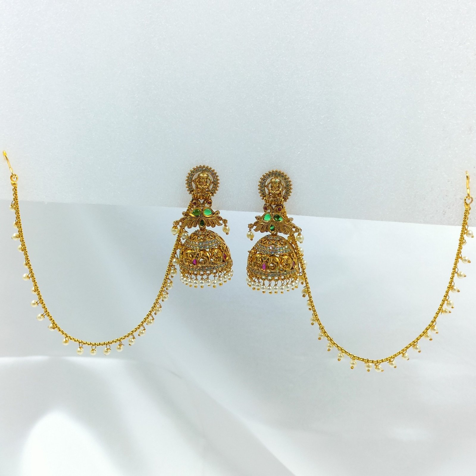 Elevate your ethnic style with our Temple Jewelry Jhumka with Ear Chain, a stunning piece of imitation temple jewellery inspired by the grandeur of South Indian heritage. Designed with intricate craftsmanship and a luxurious antique gold finish, this designer jhumka is perfect for weddings, festivals, and traditional occasions.