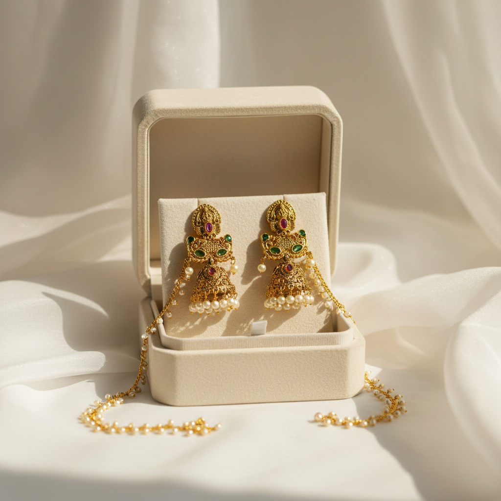 Temple Style Ear Chain Jhumkas – South Indian Imitation Jewellery with Cultural Elegance
