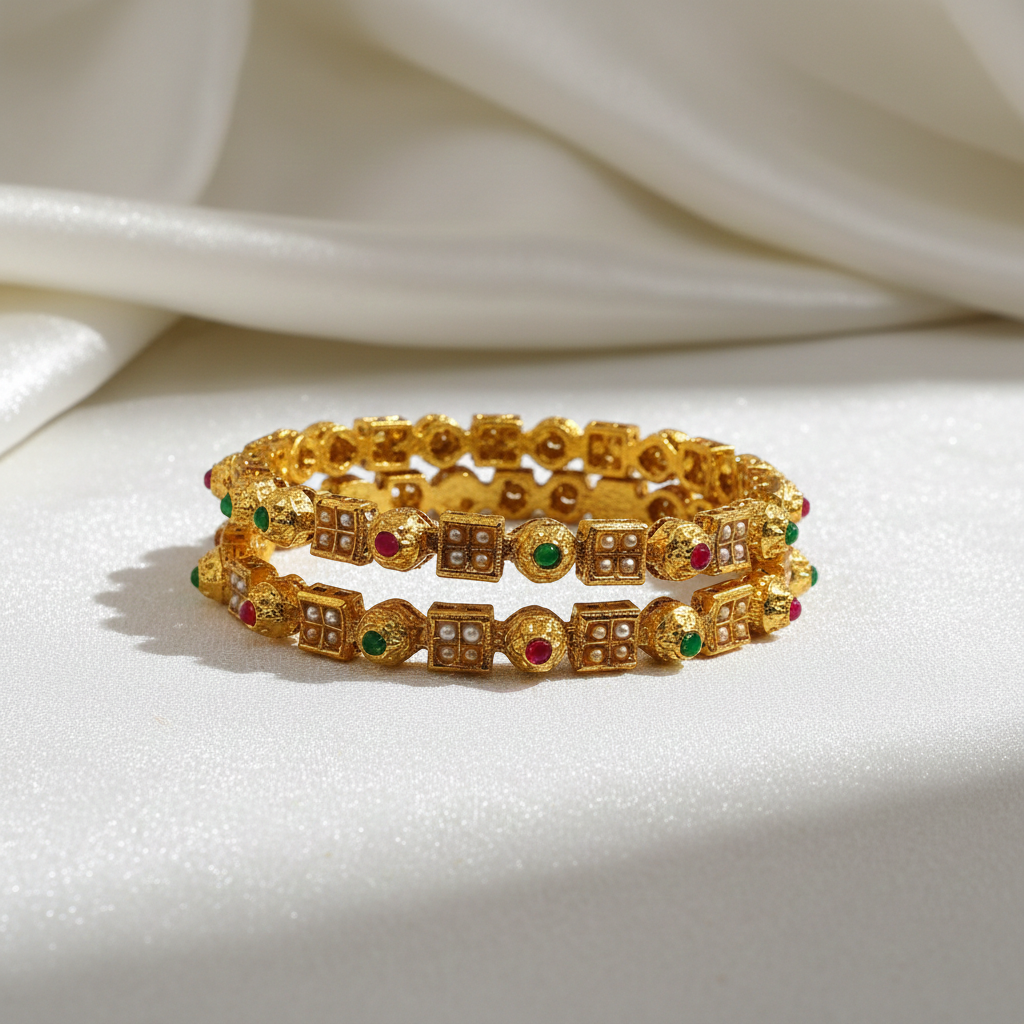 Traditional Gold Plated Bangles bring classic elegance to every jewellery collection. Available at Radiant Jewels Store, these bangles feature rich gold plating with colorful red and green stones. The detailed craftsmanship reflects heritage artistry while offering a design that complements modern style.