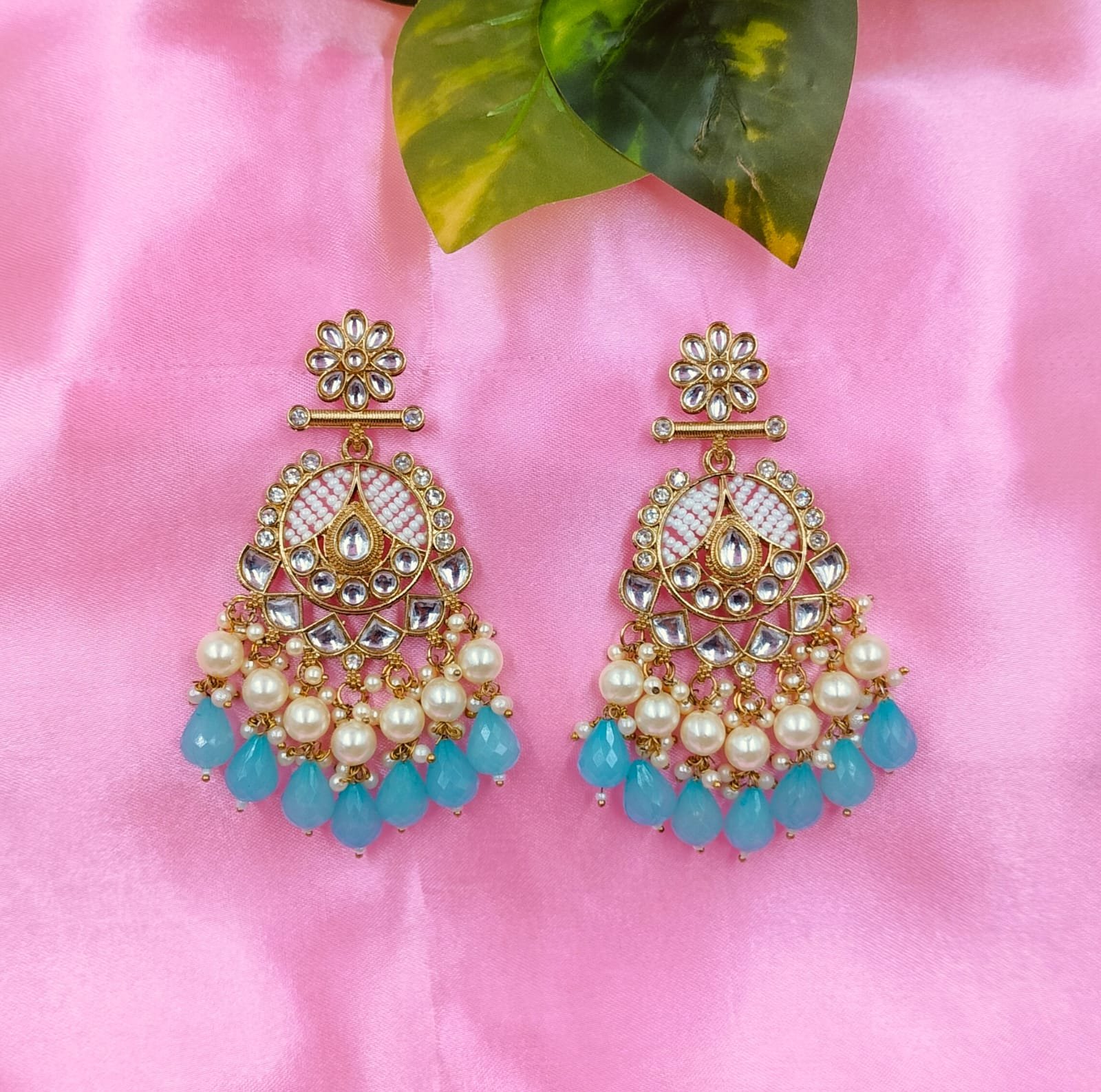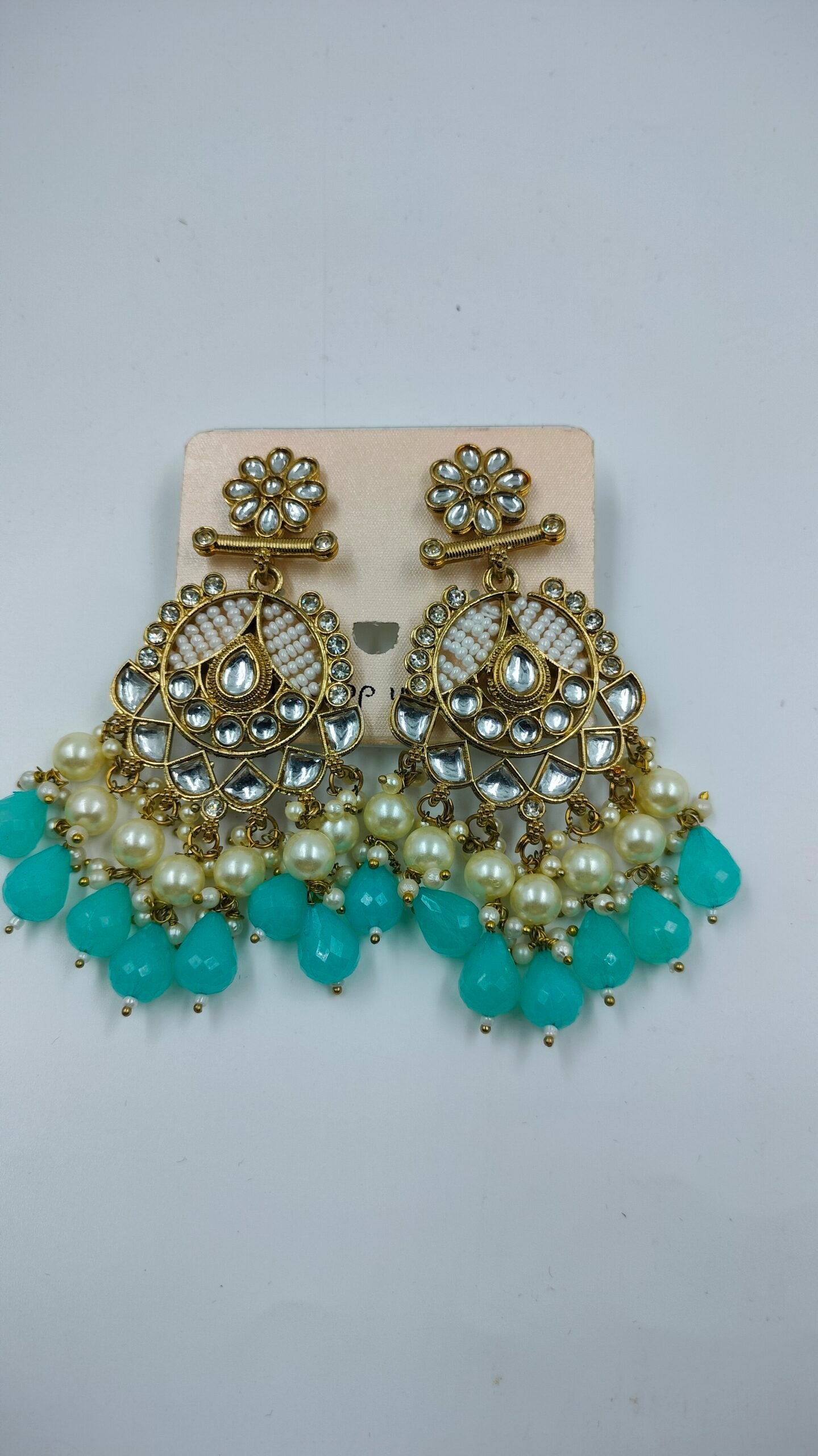 These Turquoise Kundan Chandbalis are crafted using high-quality alloy that ensures durability and long-lasting shine. The earrings are lightweight despite their bold design, so you can wear them comfortably for hours without strain. Whether you’re pairing them with a vibrant lehenga, an elegant saree, or an anarkali suit, these earrings will elevate your entire look effortlessly.