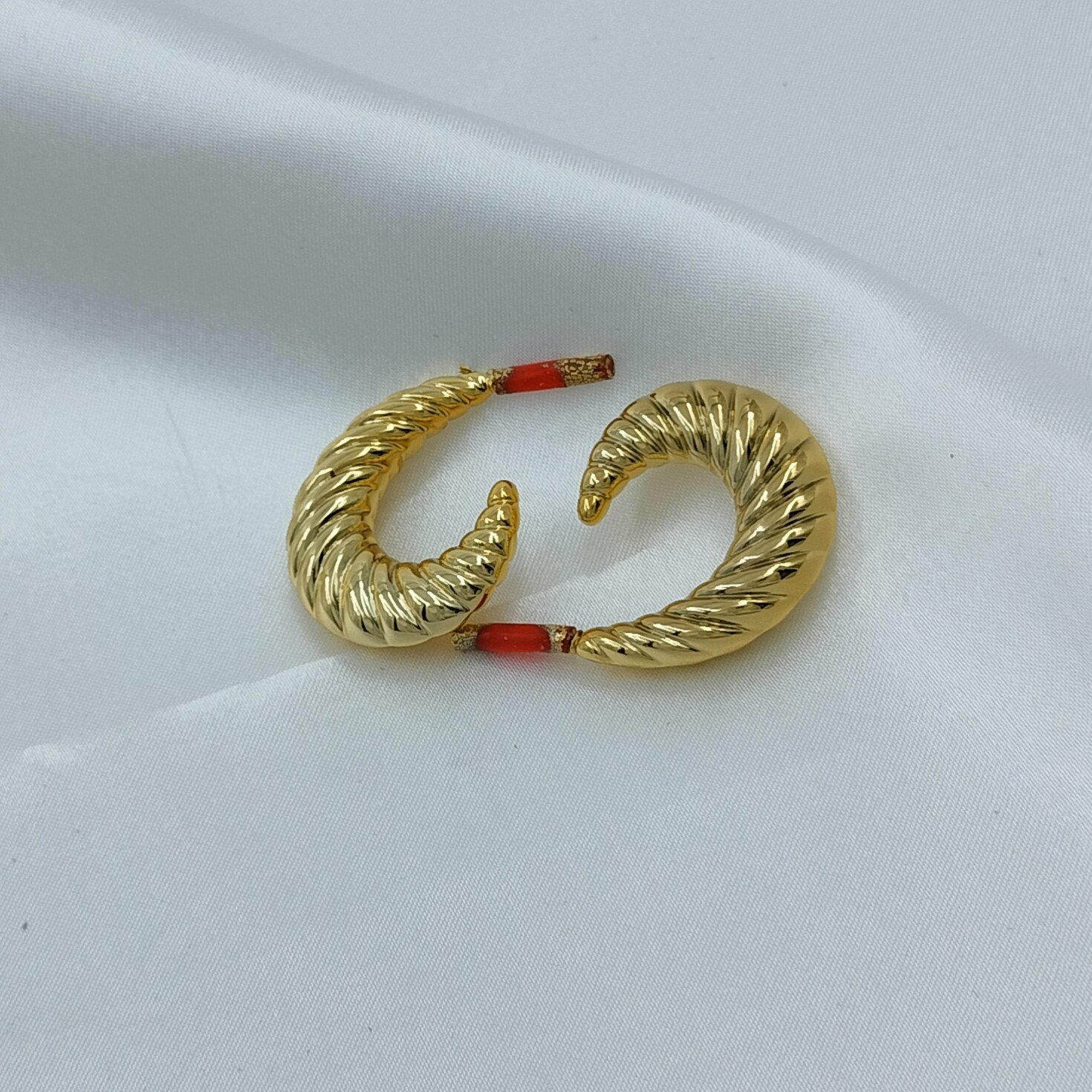 These exclusive hoops from Radiant Jewels feature a sleek, twisted gold texture with a high-polish finish. The subtle red enamel accent near the ear post adds just the right pop of color—elegant, not overpowering. Whether it’s a festival, brunch, or business dinner, these hoops elevate your style instantly.