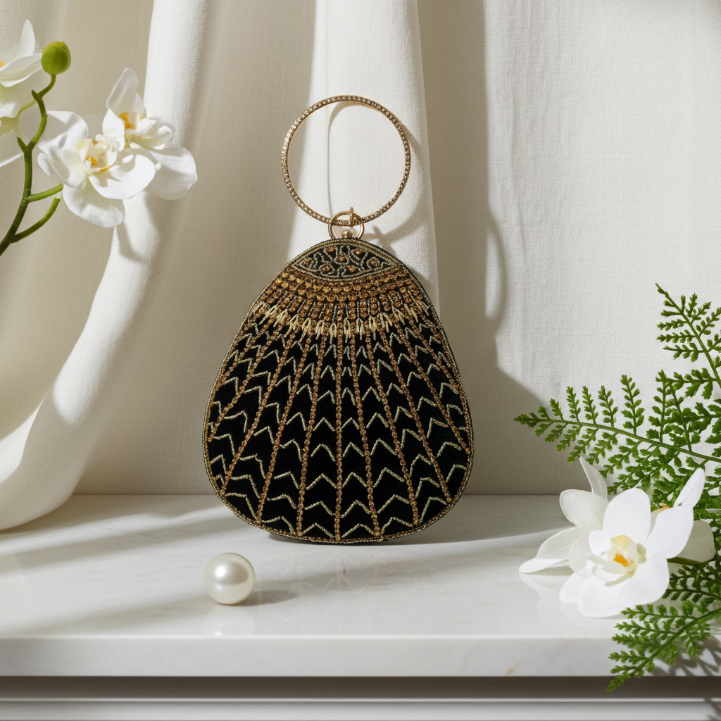 Step into the spotlight with the Velvet Gold Beaded Ring-Handle Clutch, a statement accessory designed for women who appreciate timeless elegance with a modern edge. Crafted from luxe velvet and richly adorned with shimmering golden beadwork, this clutch is the perfect blend of tradition and contemporary charm.