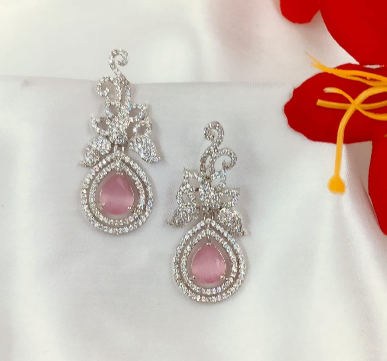 If you’re someone who loves subtle glam with a hint of color, this pair is your go-to. The clear CZ stones sparkle beautifully with every movement, while the soft pink drop lends a romantic, refreshing vibe. These earrings are light enough for everyday elegance yet eye-catching enough for festive celebrations.